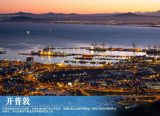 【開(kāi)普敦】是歐裔白人在南非建立的第一座城市,這座南非白人心中的母城三百余年來(lái)數(shù)度易主,歷經(jīng)荷、英、德、法等歐洲諸國(guó)的統(tǒng)治及殖民,雖然地處非洲,但卻充滿(mǎn)多元?dú)W洲殖民地文化色彩。開(kāi)普敦集歐洲和非洲人文、自然景觀(guān)特色于一身,因此名列世界最美麗的都市之一,也是南非最受歡迎的觀(guān)光都市。
