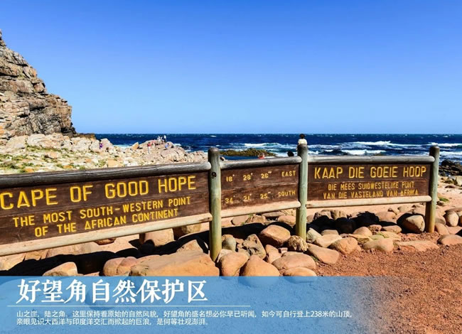 【好望角】于開(kāi)普半島南端,在保護(hù)區(qū)內(nèi),鐵銹色凹凸不平的地面上生長(zhǎng)著一片片低矮的灌木叢和被稱(chēng)為南非國(guó)花的山龍眼,狒狒、非洲旋角大羚羊等動(dòng)物間或在眼前一躍而過(guò)。在大西洋邊紅色的卵石灘上,時(shí)常可見(jiàn)駝鳥(niǎo)閑庭信步的可愛(ài)模樣。在保護(hù)區(qū)的西南端有一個(gè)如同伸入大西洋中巨大鱷魚(yú)爪的岬角。